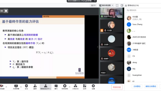 应公司邀请,7月20日早上,美国伊利诺伊大学香槟分校张苏苏助理教授在腾讯会议作了题为《基于过程性数据的能力评估(Accurate Assessment via Process Data)》的报告。相关师生聆听了此次报告,报告由付志慧老师主持。