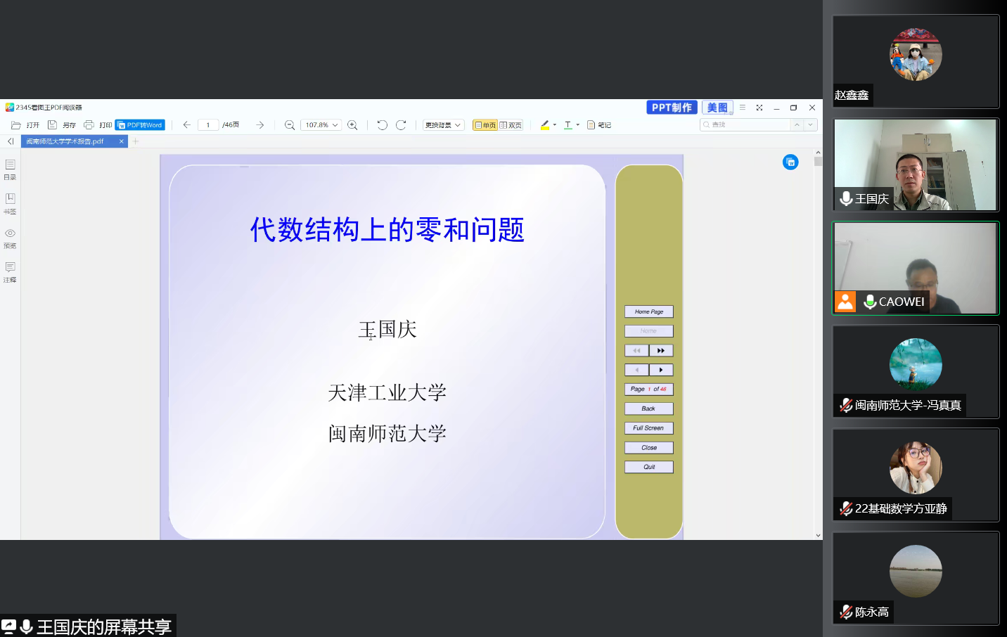 应公司邀请,10月14日下午,天津工业大学数学科学学院王国庆教授在腾讯会议作了题为《代数结构上的零和问题》的报告。相关师生聆听了此次报告,报告由曹炜老师主持。