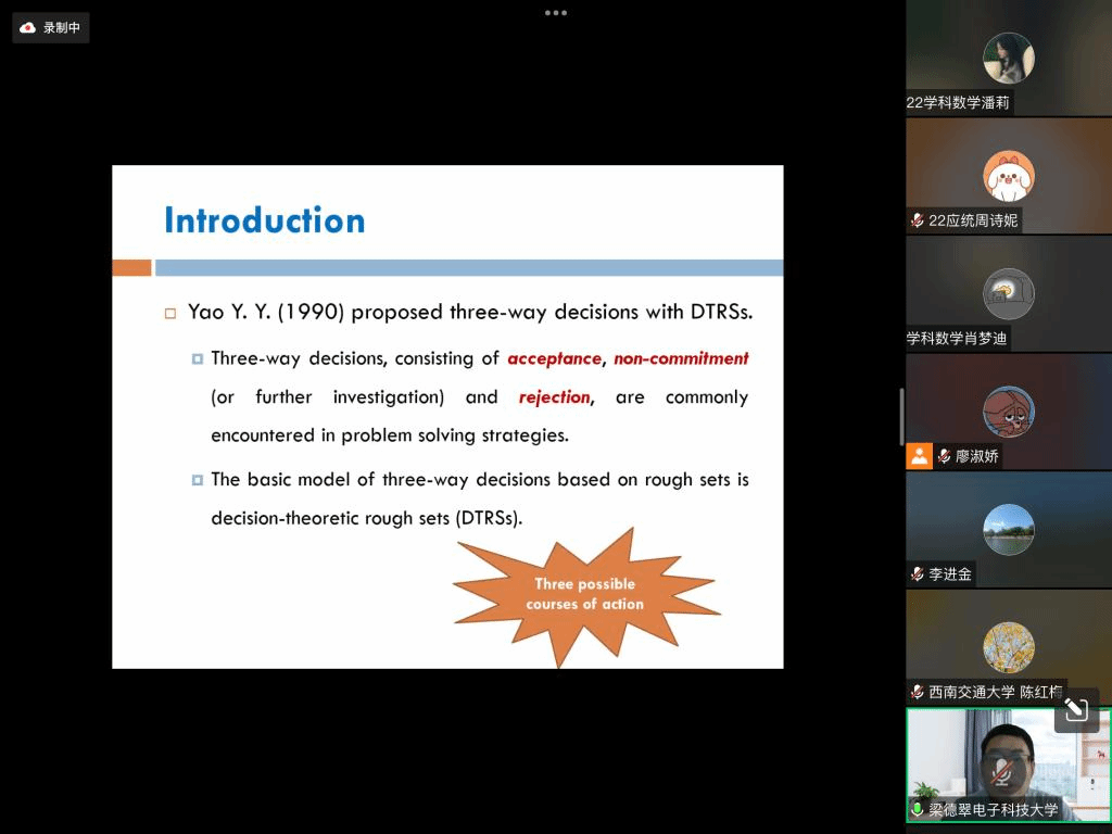 应公司邀请,10月18日下午,电子科技大学梁德翠教授在腾讯会议作了题为《三支决策中的偏好学习与共识机制研究》的报告。相关师生聆听了此次报告,报告由廖淑娇老师主持。