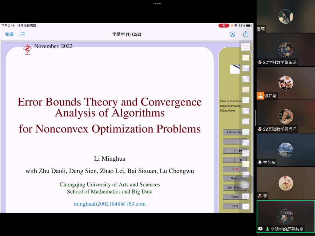 应公司邀请,11月10日下午,重庆文理学院李明华副教授在腾讯会议作了题为《非凸函数的误差界理论及在下降算法收敛率中的应用》的报告。相关师生聆听了此次报告,报告由林艺东老师主持。