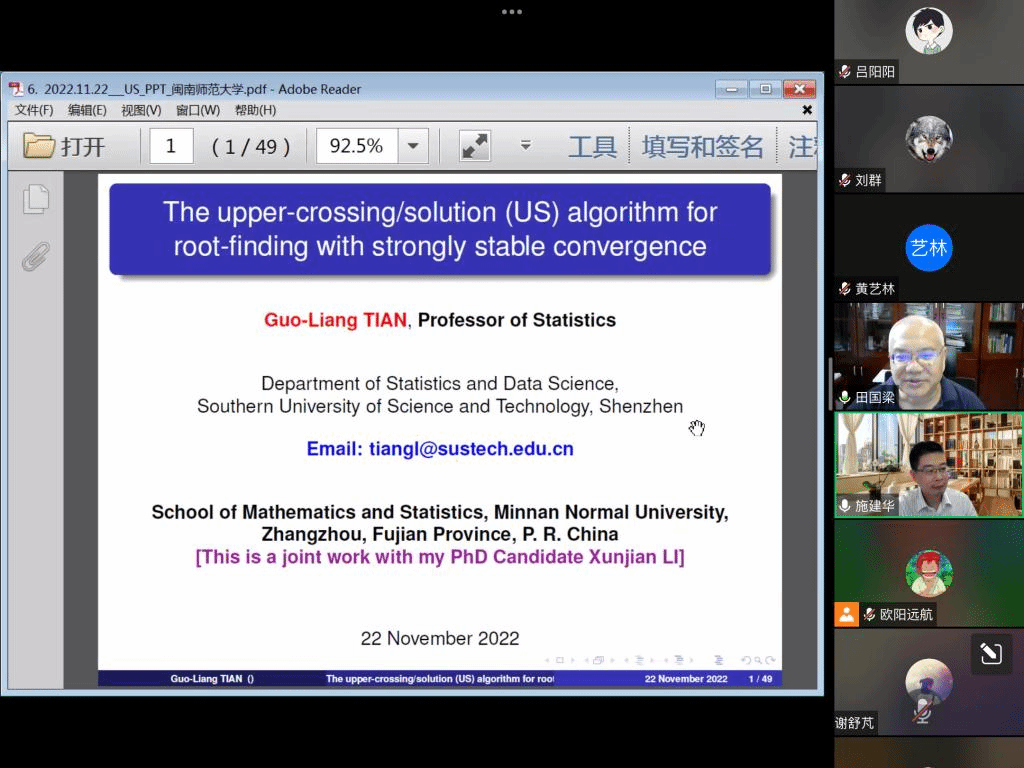 应公司邀请,11月22日下午,南方科技大学田国梁教授在腾讯会议作了题为《The upper-crossing/solution (US) algorithm for root-finding with strongly stable convergence》的报告。相关师生聆听了此次报告,报告由施建华老师主持。
