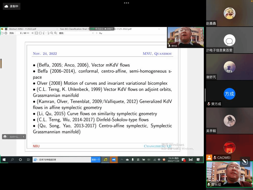 报告中,屈长征教授在此次会议中从不同的角度对某些几何形状中的不变几何流进行了广泛的研究。本次会议中主要关注多分量可积系统的几何方面。首先,给出了一些来自不同几何结构的可积系统的例子。其次,证明了一些新的可积系统是由某些几何中不变的几何流产生的。第三,将研究这些可积系统的性质。最后,将研究这些可积系统的性质最后,将讨论与多分量可积几何流相关的一些问题。报告结束后,在座的师生就相关研究问题进行了探讨和交流。