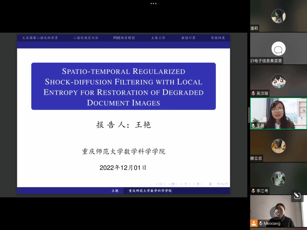 应公司邀请,12月1日下午,重庆师范大学王艳教授在腾讯会议作了题为《Spatio-temporal regularized shock-diffusion filtering with local entropy for restoration of degraded document images》的报告。相关师生聆听了此次报告,报告由黄梅香老师主持。