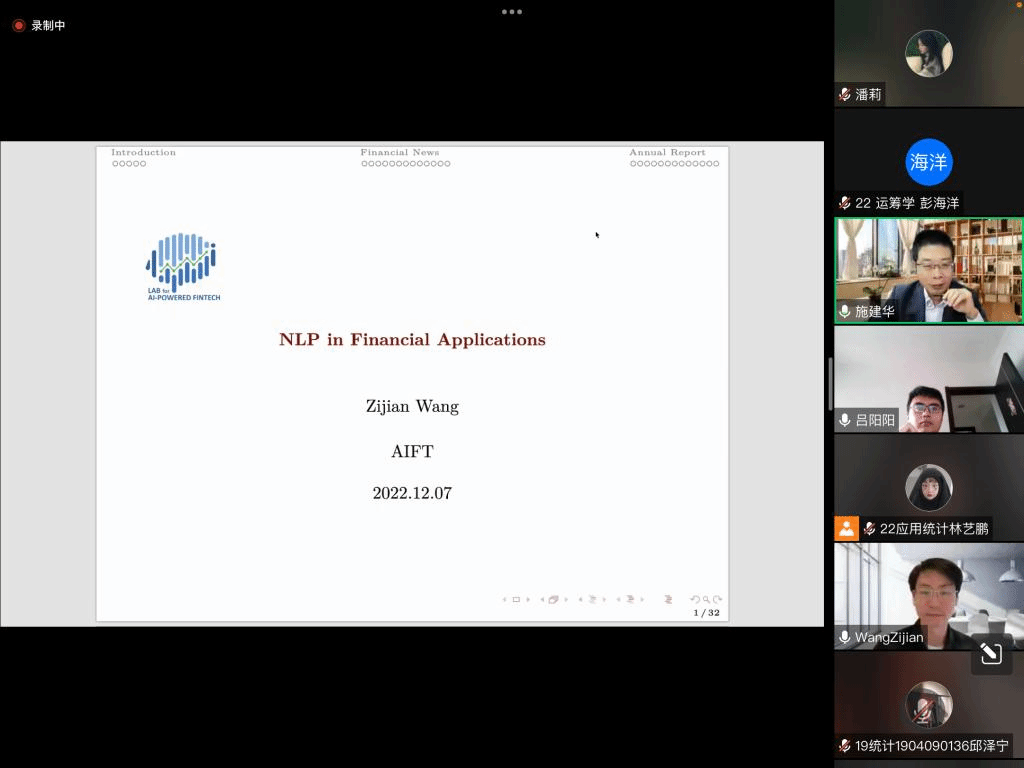 应公司邀请,12月7日下午,香港人工智能金融科技实验室研究员王子剑在腾讯会议作了题为《自然语言处理在金融中的应用》的报告。相关师生聆听了此次报告,报告由施建华和吕阳阳老师主持。