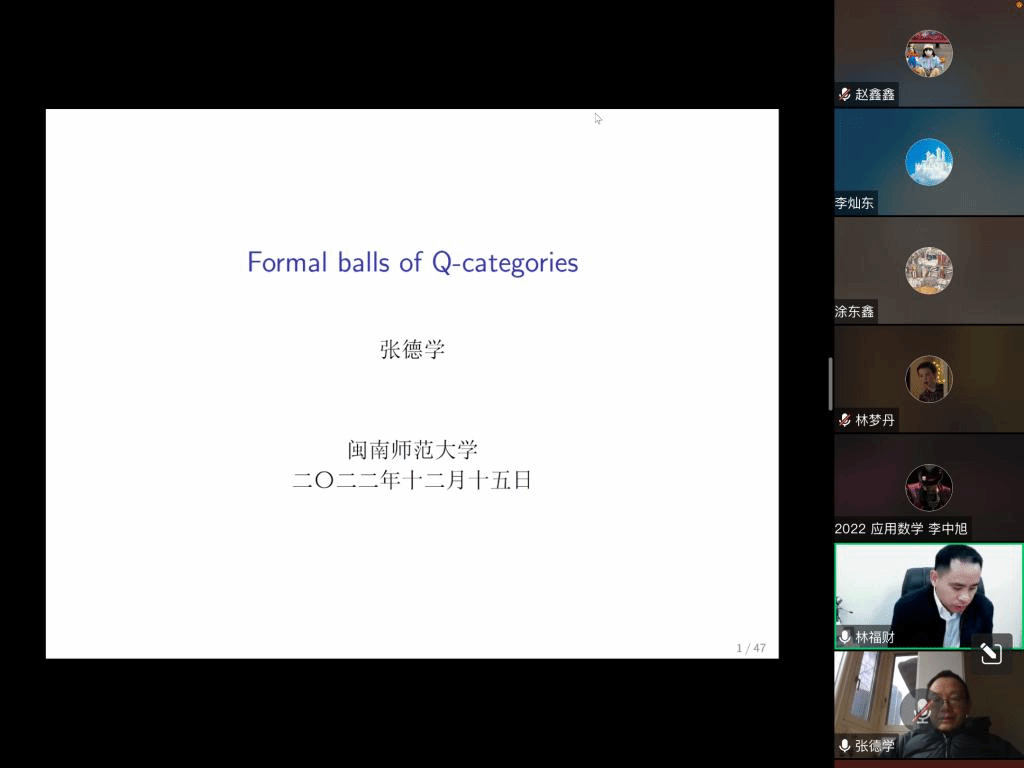 应公司邀请,12月15日下午,四川大学张德学教授在腾讯会议作了题为《Formal balls of Q-categories》的报告。相关师生聆听了此次报告,报告由唐忠宝老师主持。