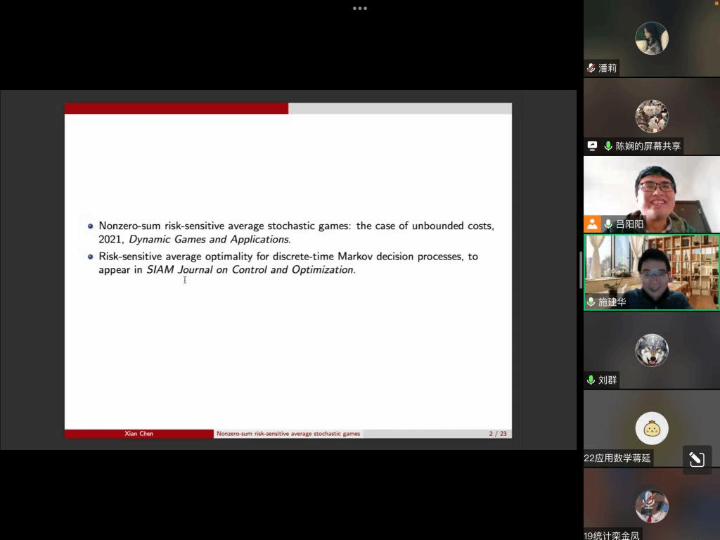 应公司邀请,12月27日下午,厦门大学陈娴副教授在腾讯会议作了题为《Nonzero-sum Risk-Sensitive Average Stochastic Games》的报告。相关师生聆听了此次报告,报告由吕阳阳老师主持。