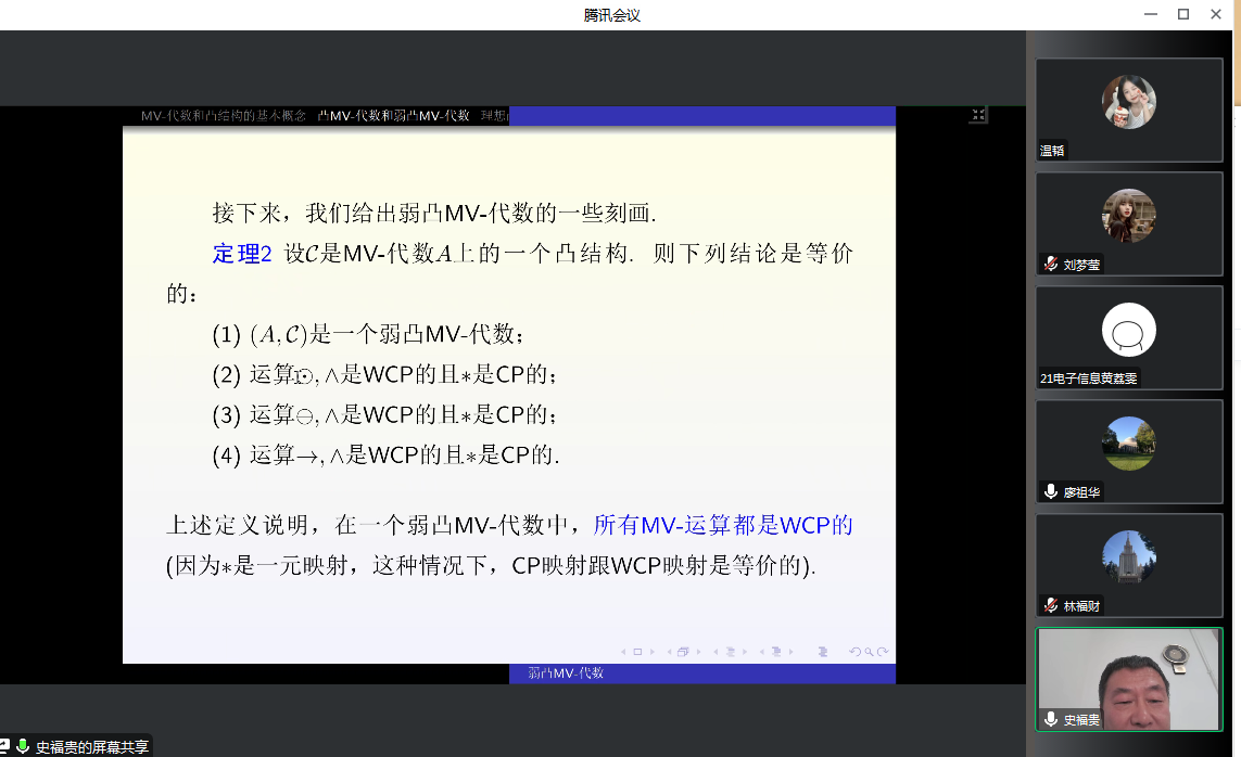 应公司邀请,3月4日早上,BV伟德官方网站史福贵教授在腾讯会议作了题为《弱凸MV-代数》的报告。相关师生聆听了此次报告,报告由林福财老师主持。