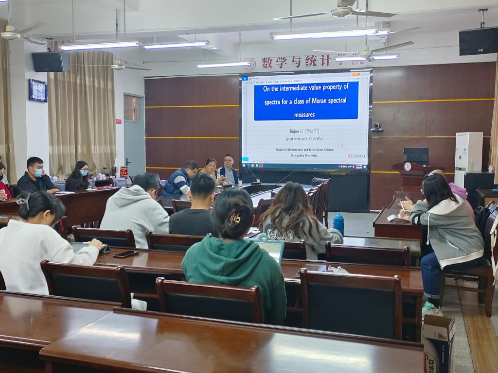 应公司邀请,3月18日下午,广州大学李进军教授在砺志楼114作了题为《On the intermediate value property of spectra for a class of Moran spectral measures》的报告。相关师生聆听了此次报告,报告由林国平老师主持。