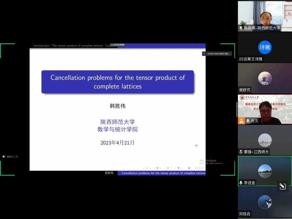 应公司邀请,4月21日下午,陕西师范大学韩胜伟教授在腾讯会议作了题为《Cancellation problems for the tensor product of complete lattices》的报告。相关师生聆听了此次报告,报告由孙文老师主持。