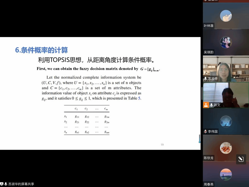 报告中,苏淑华教授针对不完全信息系统中缺失信息的填充、条件概率和损失函数的计算等问题,提出了一种基于不完全信息的三元决策模型。首先,通过基于相似性填充缺失信息来获得新的信息表,并通过TOPSIS与信息表的组合思想建立条件概率计算方法。基于不同属性下的风险规避系数计算相对损失函数。然后,我们提出了区间相对损失函数的概念,并给出了区间相对损耗函数值的计算公式。特别总结了构建三方决策模型的关键步骤。最后,以医学诊断为例验证了该方法的有效性。此外,通过敏感性分析和比较分析验证了该方法的合理性和优越性。报告结束后,在座的师生就相关研究问题进行了探讨和交流。