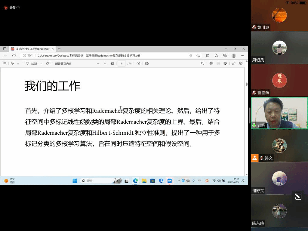 应公司邀请,4月25日下午,华北电力大学陈德刚教授在腾讯会议作了题为《基于局部拉德马赫复杂度的多核学习》的报告。相关师生聆听了此次报告,报告由孙文老师主持。