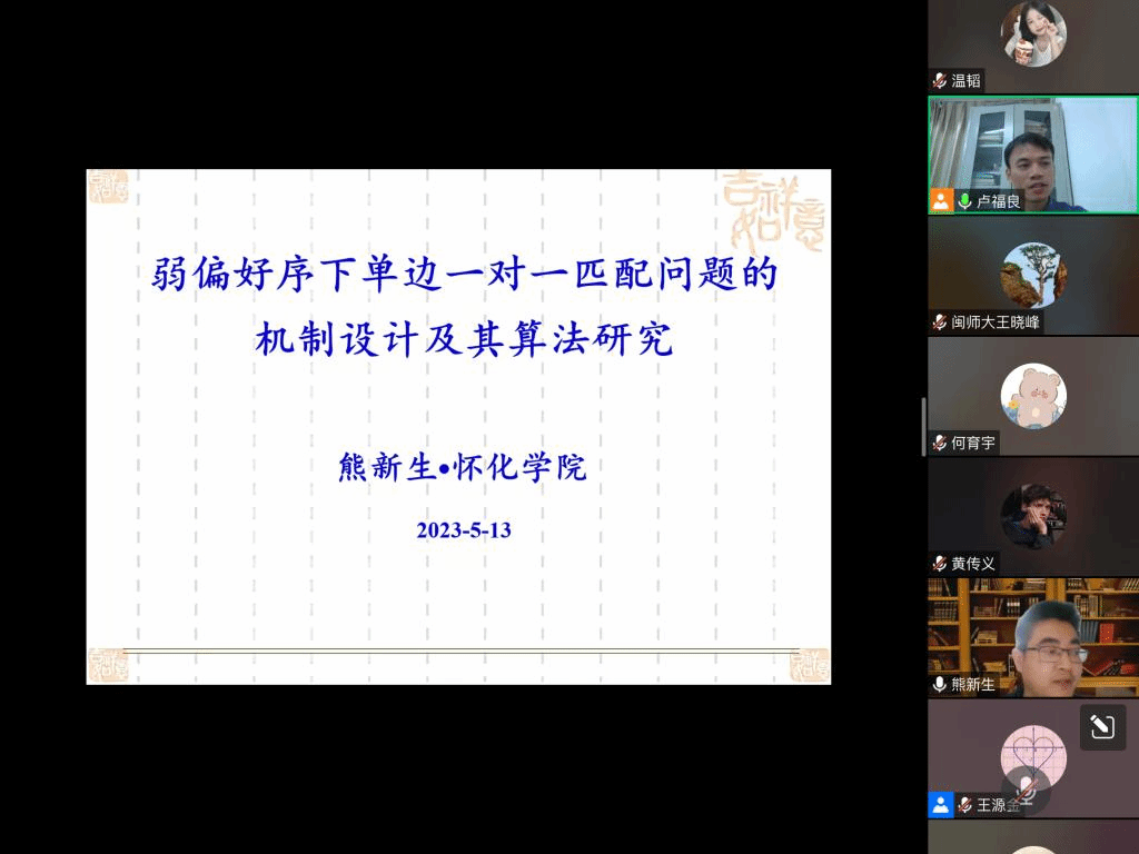 应公司邀请,5月13日晚上,怀化学院熊新生副教授在腾讯会议作了题为《弱偏好序下单边一对一匹配问题的机制及其相应算法设计》的报告。相关师生聆听了此次报告,报告由卢福良老师主持。