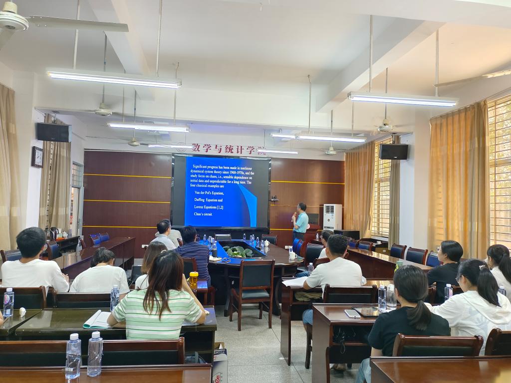 报告中,杨启贵教授的报告涉及由多维线性双曲偏微分方程控制的系统的动力学。线性偏微分方程的动力学行为非常依赖于空间的选择,传统的方法是定义一个无限维的空间,并给出一个调整参数。从而使线性偏微分方程在不同的调谐参数范围内表现出混沌或稳定。在多元解析函数的Banach空间上建立了当调谐参数超过某一给定正数时,系统对应的C0-半群的混沌。在此基础上,进一步得到了系统的Devaney混沌和分布混沌。同时,证明了当调谐参数小于某个正数时,C0-半群是一致指数稳定的,这有助于显示系统的全局稳定性。最后,给出了两个例子来说明我们结果的有效性。报告结束后,在座的师生就相关研究问题进行了探讨和交流。