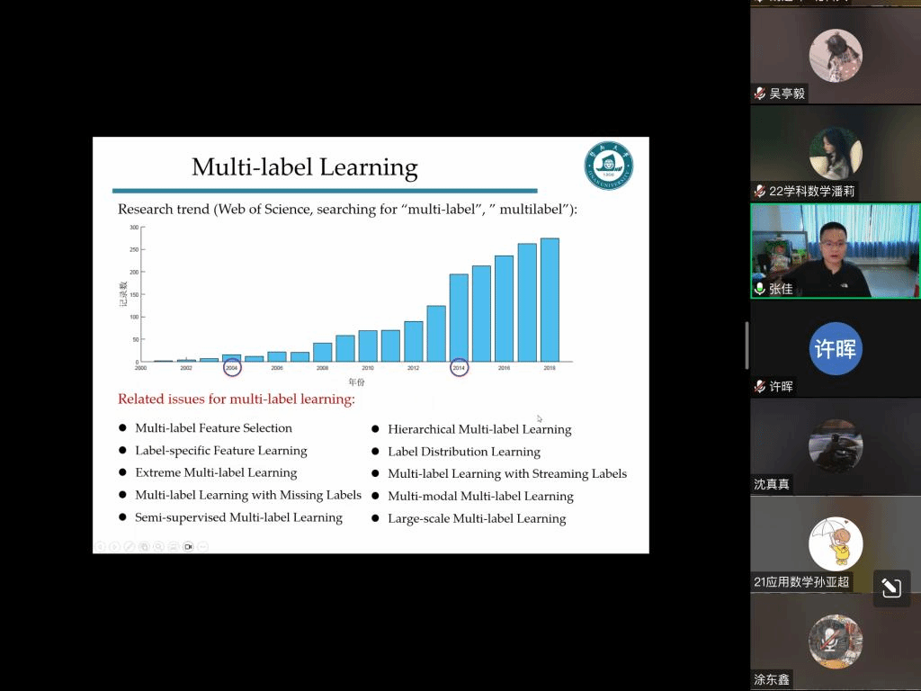 报告中,张佳博士的报告讲解了在多标记学习中,每个对象由一个示例描述,该示例可能具有多个类别标记,学习的目标是将所有相关的类别标记赋予未见示例。本报告主要介绍多标记信息监督下的有判别力特征分析的三种方法:特征选择,类属特征学习,深度特征学习。报告结束后,在座的师生就相关研究问题进行了探讨和交流。