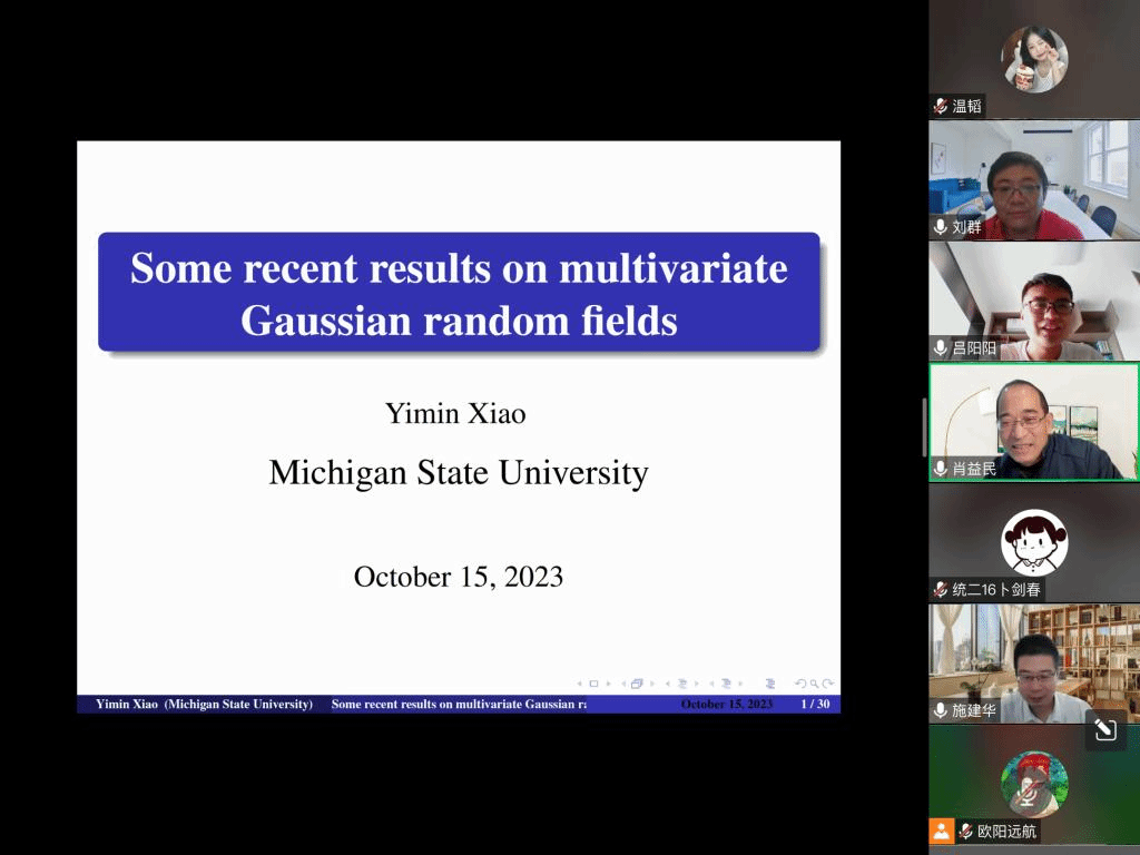 应公司邀请,10月15日上午,密西根州立大学肖益民教授在腾讯会议作了题为《Some recent results on multivariate Gaussian random fields》的报告。相关师生聆听了此次报告,报告由施建华老师主持。