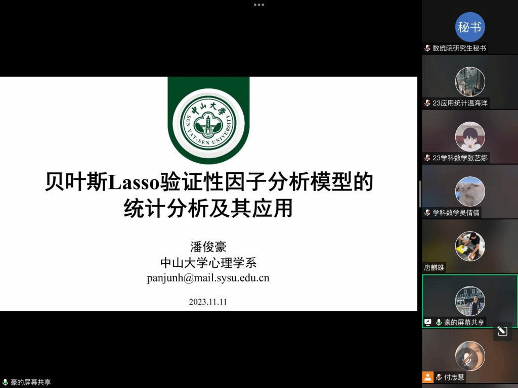 应公司邀请,11月11日下午,中山大学潘俊豪教授在腾讯会议作了题为《贝叶斯Lasso验证性因子分析模型的统计分析及其应用》的报告。相关师生聆听了此次报告,报告由付志慧老师主持。